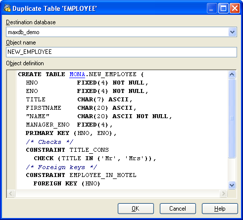 Note: the name of the object must be unique among all the object names in its container. Moreover, all the objects that are source of data need unique names among themselves. You can use any identifier that is allowed by MaxDB server.