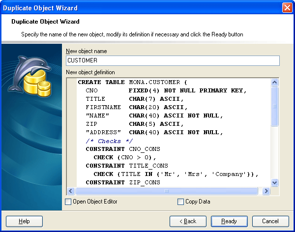Set the name for the new database object. If you need you can also edit the result SQL statement manually, add or remove fields, change field types, using the New object definition text area. Click the Ready button to complete the operation.