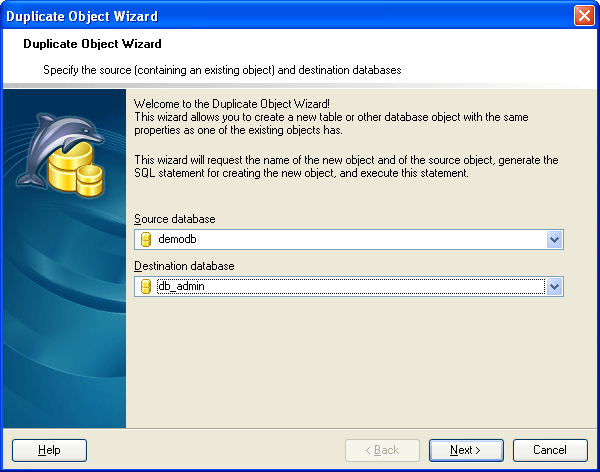 Select the database containing a source object from the list of connected databases, then specify the database for the duplicated object. You should connect to the destination database beforehand (see Database Management).