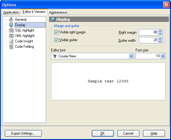 The Editors & Viewers tab of the Options dialog allows you to set the parameters of viewing and editing the SQL statements within MaxDB Maestro.