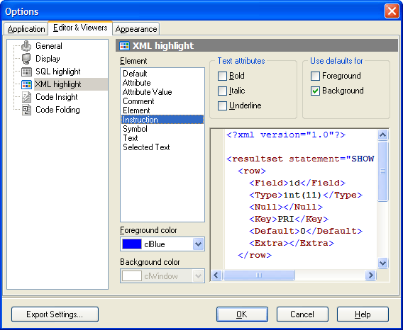 Use the XML highlight item to customize syntax highlight for the XML tab of the Table Editor. Select the text element from the list, e.g. attribute or attribute value and adjust its foreground color, background color and text attributes according to your wishes.
