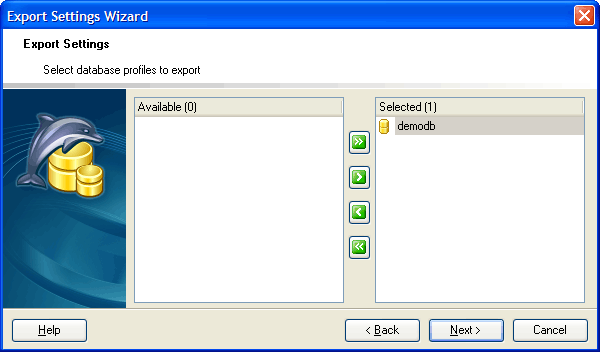 MaxDB Maestro online HelpSelecting database profilesSelect database profiles to save their settings by moving them from the Available Databases list to the Selected Databases one.   |