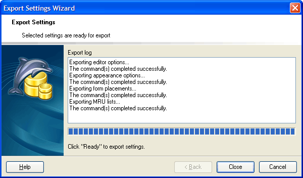 MaxDB Maestro online HelpSaving settingsClick the Ready button to start the extracting. The process log is displayed in the Export log box.   |