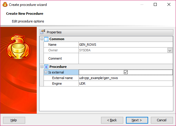 To create an external procedure or function, turn ON the appropriate checkbox, specify an external module name and a name of function or procedure in this module.
