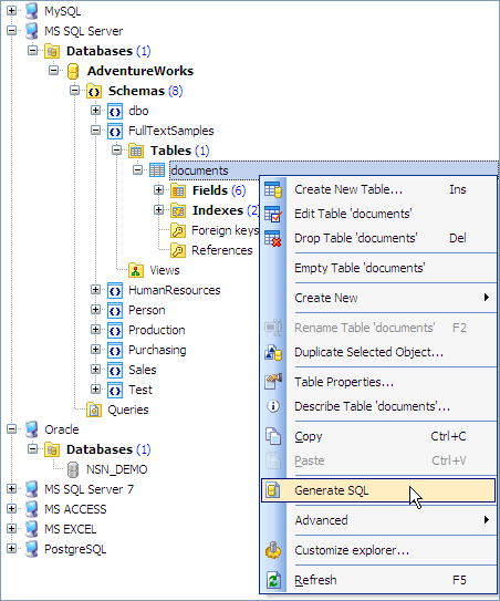 Database Explorer allows you to perform the following operations with database objects using its popup menu (note that the popup menu contains object-specific items only when some database object is currently selected in the explorer tree):