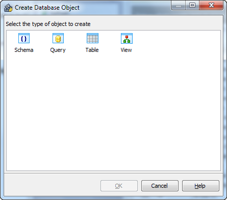 The Create Database Object dialog allows you to create any type of database object supported by AnySQL Maestro. To open the dialog select the Object | Create Database Object... main menu item or use the Shift+Ctrl+N hot keys combination. Select an object type icon and click the OK button to invoke the corresponding wizard or dialog.
