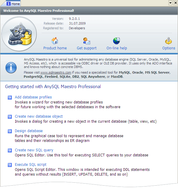 The window provides you with quick access to the Create Database Object dialog, Schema Designer, SQL Editor, and SQL Script Editor recently used database profiles. At the bottom of the page the latest company news and current discount programs are represented.