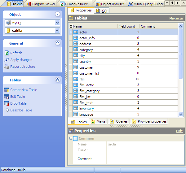 Every tab is intended for managing corresponding database objects (e.g. tables, views, queries, etc.). Open the object in its editor by double-clicking or pressing the Enter key. The popup menu allows you to create new, edit or drop the selected database objects. Using this menu you can also create a copy of the object.