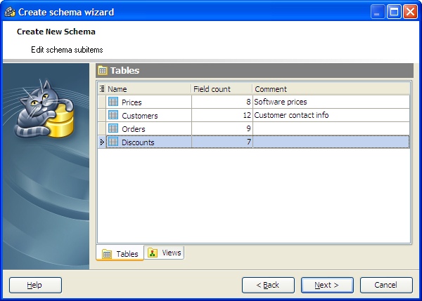 | • | Open the corresponding tab (Tables - to manage schema tables, Views - to manage schema views); |