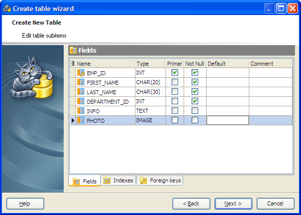 On this step of the wizard you can fullfill the new table with fields, indexes, and foreign keys. To add a new object: