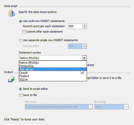 Get SQL Dump Wizard allows you to export data from a table or a query result to the SQL script as a number of INSERT statements.