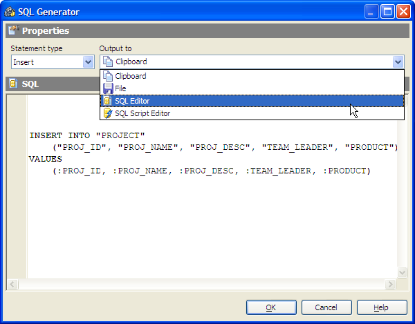 Among other features AnySQL Maestro provides you with SQL Generator, a tool to create simple SQL statements. Just choose a database object, select statement type (Definition, Select, Insert, Update, or Delete) and the destination device (Clipboard, File, SQL Editor, SQL Script Editor).
