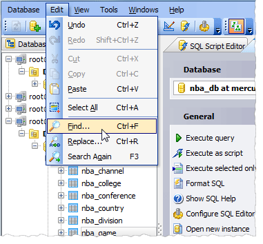 AnySQL Maestro provides two dialogs for searching and replacing text in the editor areas of the database tools. Both of them are available through the popup menu of the editor area.