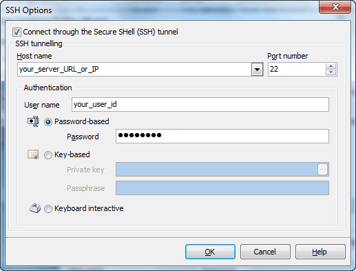 | 3. | Check Connect through the Secure Shell (SSH) tunnel and complete the following fields: |