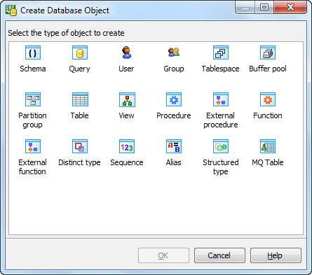 The Create Database Object dialog allows you to create any type of database object supported by DB2 Maestro. To open the dialog select the Object | Create Database Object... main menu item or use the Shift+Ctrl+N hot keys combination. Select an object type icon and click the OK button to invoke the corresponding wizard or dialog.