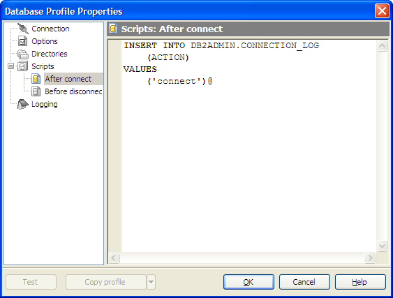 Below you can find an example of an obligatory script to execute after DB2 Maestro will connect to the database. The script writes a connect time to the log table.