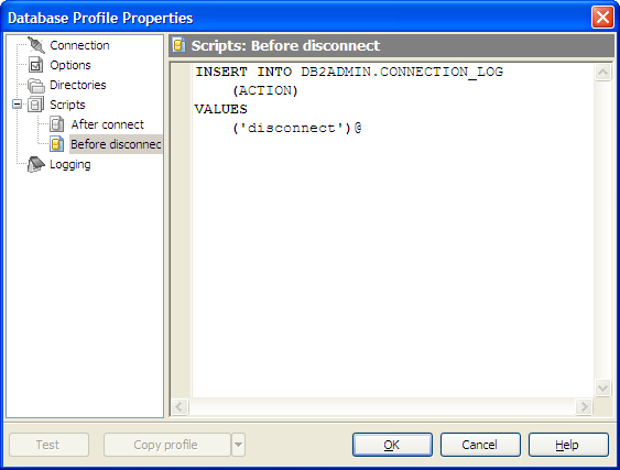 The next screen represents the example of an obligatory script to execute before DB2 Maestro will disconnect from the database. The script writes a disconnect time to the log table.