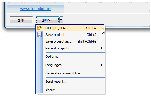 To create a project, configure data sources and click More > Save Project at any next step (Ctrl+S) or More > Save Project as... (Ctrl+Shift+S). All the settings you have made will be saved to a file.
