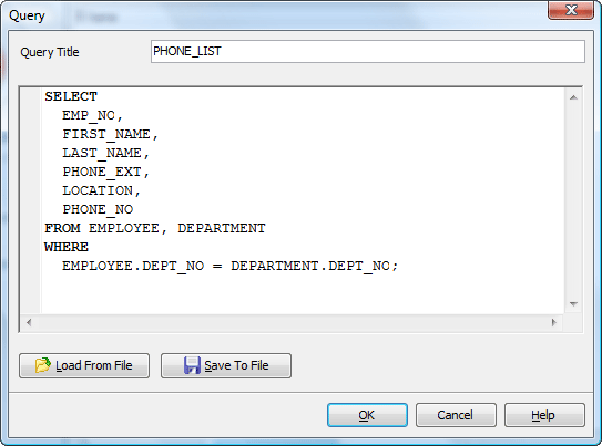 To use a custom SQL query as a data source, use the Create query button and enter the query name and a SELECT statement. It is also possible to load a query from an .sql file.
