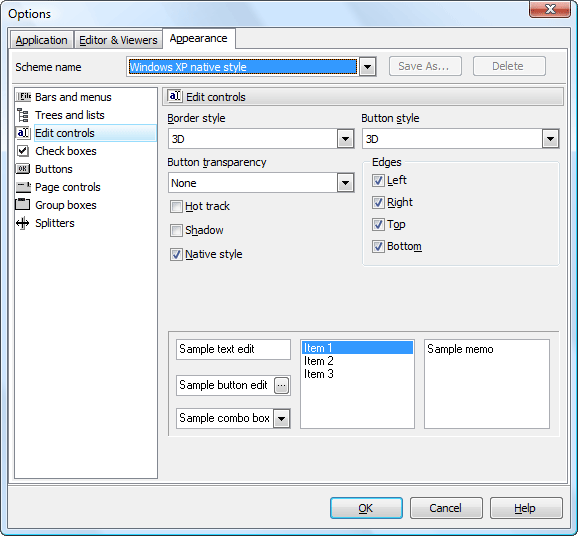 Use the Edit controls item to customize the appearance of different Firebird Data Wizard edit controls. The tab allows you to select the edit controls border style, button style and transparency, enable/disable hot tracks, shadows, native style and customize edges. It is also possible to define samples for the text edit, button edit and combo box controls.
