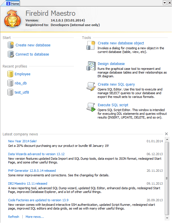 The window provides you with quick access to the Create Database Object dialog, Schema Designer, SQL Editor, and SQL Script Editor recently used database profiles. At the bottom of the page the latest company news and current discount programs are represented.