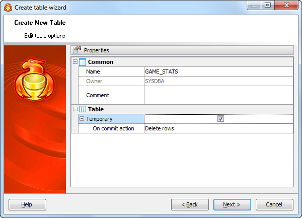 Check the Temporary box to create a global temporary tables (Firebird 2.1+). Global temporary tables are tables that are stored in the system catalogue with permanent metadata, but with temporary data. Data from different connections (or transactions, depending on the scope) are isolated from each other, but the metadata of such tables are shared among all connections and transactions. In ca se the option is ON, select the On commit action: