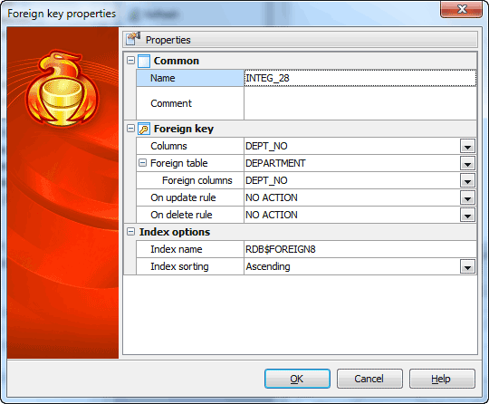 Set the Foreign Key Name, select Columns from the Available Fields list to include into the foreign key, select the Foreign Table Name from the drop-down list and its fields from the list to include, set other foreign key properties and apply the changes by clicking the OK button.
