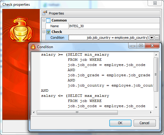 The Check Properties editor allows you to add a new check constraint or edit an existing one. This dialog can be invoked from Table Editor, or via the popup menu of the corresponding nodes of the explorer tree.