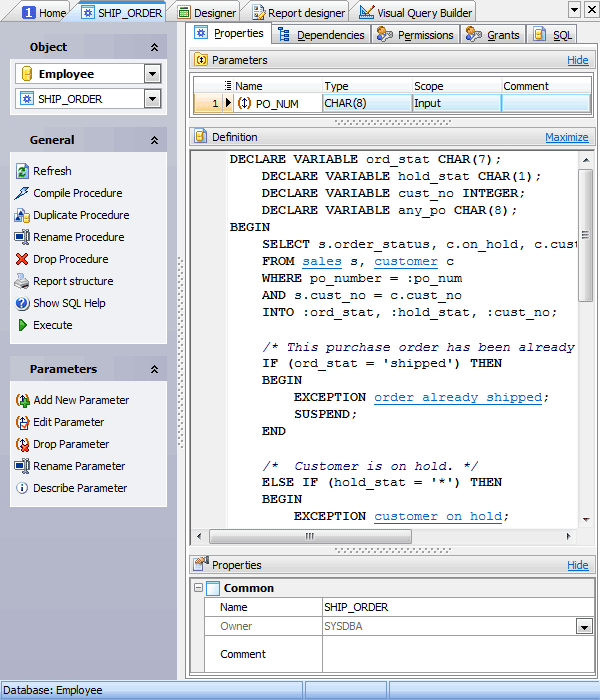 Procedure Editor allows you to execute the existing procedures or edit their definition (procedure name, parameter list, procedure body, etc.). It opens when you create a new procedure or edit the existing one (see How to edit procedure for details).