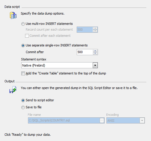 Select the data dump mode to be used (Multi-row INSERT statements or separate single-row INSERT statements) and specify commits' frequency.