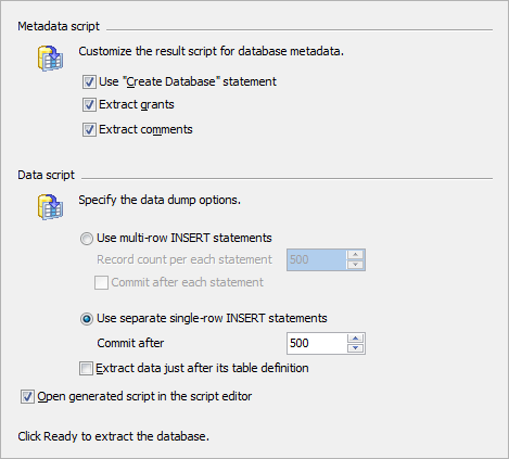 Using Extract Database Wizard you can extract database objects and data to a SQL script, e.g. for backup purposes. To run this wizard select the Tools | Extract Database main menu item.