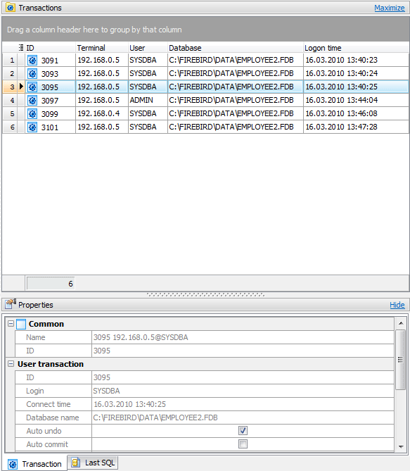 Note: Transaction Browser is available only for Firebird 2.1 and higher.