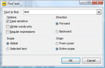 The search covers either the entire block of selected text or the entire file (no matter where the cursor is), depending upon the Scope options.