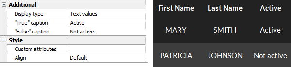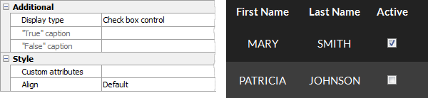 Use this control to display column values as checkboxes. This type of representation is used for columns storing BOOLEAN, or INTEGER data. Firebird PHP Generator provides you with the following types of the control appearance.