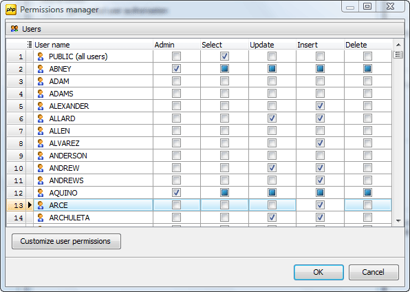 On using this kind of authorization, all users and their permissions are stored in generated .php files, so it is necessary to re-generate the application to modify this data. Use the checkboxes at the Permissions tab to grant/revoke the corresponding application-level permissions to users specified at the Hard-coded authorization window. To grant or revoke page-level permissions, use the Customize page level permission... button.