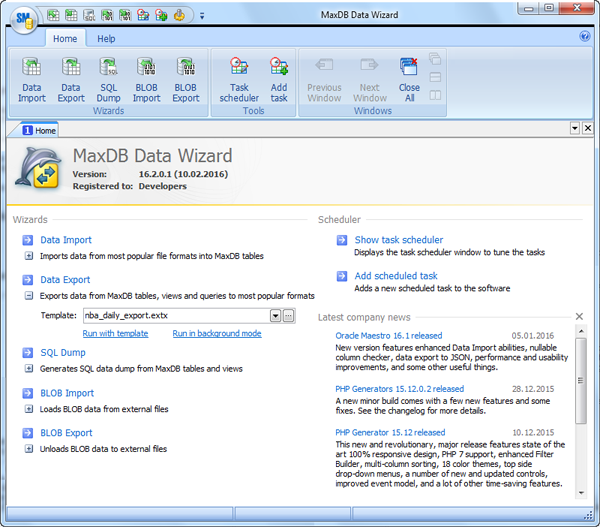 This way is useful if you already have a template which does not require further customizing. To supply a wizard with all the session parameters from a template file and execute it in background mode, specify a template file at the Home page and click Run in background mode. Besides, you can specify a time to execute the task within the Task Scheduler.