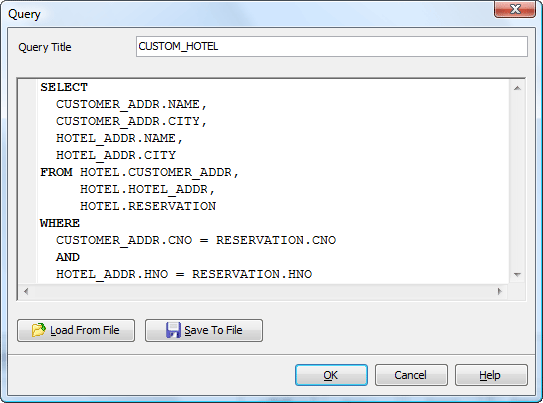 To use a custom SQL query as a data source, use the Create query button and enter the query name and a SELECT statement. It is also possible to load a query from an .sql file.