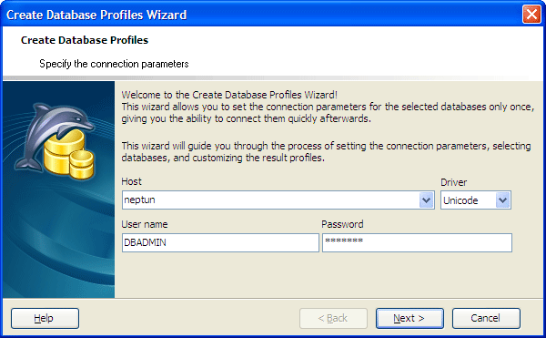 Create Database Profiles Wizard allows you to create a single database profile or several profiles from one host. To run the wizard, select the Database | Create Database Profiles... main menu item, or press the Shift+Ctrl+P hot keys combination. You can also use the Create Database Profiles button of the main toolbar.