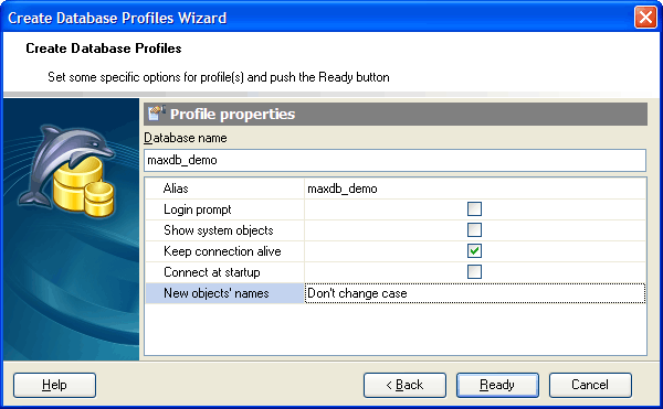 Set the database name and aliases and other options (the detailed description is given below).