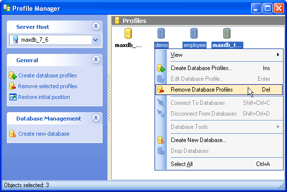 Database Profile Manager allows you to operate on several profiles at a time. You have the opportunity to select a batch of database profiles and after the profile group is selected, you can operate on it (e.g. connect or remove several profiles at once) as if it were a single profile. To start Database Profile Manager, select the Database | Database Profile Manager main menu item.