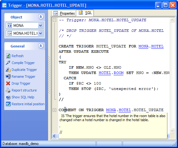 The SQL tab displays the SQL definition for the object with all its properties. Bear in mind that this text is read-only. If you want to change the object definition, use the appropriate editor tabs instead, or copy the text to the Windows Clipboard to paste it in SQL Editor or SQL Script Editor.