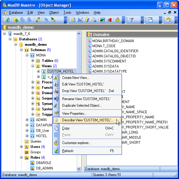 Essentially a comment is the most often altered object property. To make the action as easy as it can be the MaxDB Maestro provides an ability to describe the object within the Database Explorer immediately. At that you need not open the Object Editor.