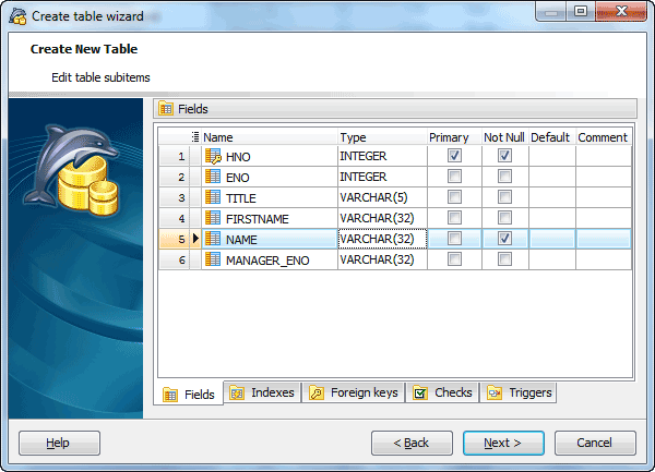 On this step of the wizard you can fullfill the new table with fields, indexes, and foreign keys. To add a new object: