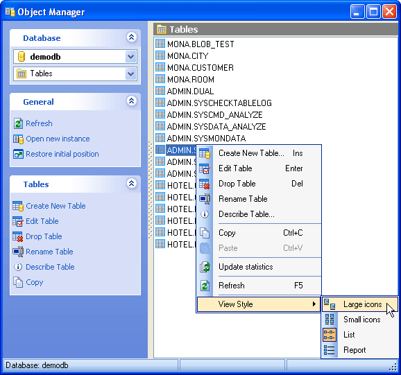 The popup menu of Object Manager may have different content depending on the current selection. The common menu items allow you to switch the object list view between four standard modes (large icons, small icons, list and report), refresh the current view, and select all the objects in the view. If none of objects are currently selected, other menu items are unavailable to use, except of the one for creating a new object. If one or more objects are selected, clipboard operations (such as copy and paste) become available as well as the items for editing and dropping selected object(s). If the current object type of the Object Manager is "Tables", the Empty Table(s) menu item is also available.
