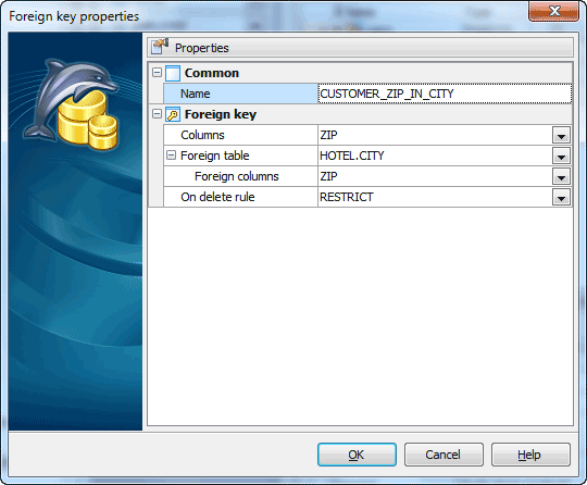 Set the Foreign Key Name, select Columns from the Available Fields list to include into the foreign key, select the Foreign Table Name from the drop-down list and its fields from the list to include, set other foreign key properties and apply the changes by clicking the OK button.