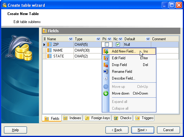 | • | Choose a necessary page (Fields - to manage table fields, Indexes - to manage table indexes, and so on); |