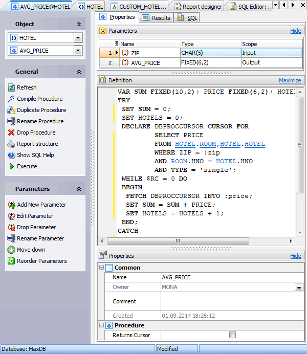 Procedure Editor allows you to execute the existing procedures or edit their definition (procedure name, parameter list, procedure body, etc.). It opens when you create a new procedure or edit the existing one (see How to edit procedure for details).