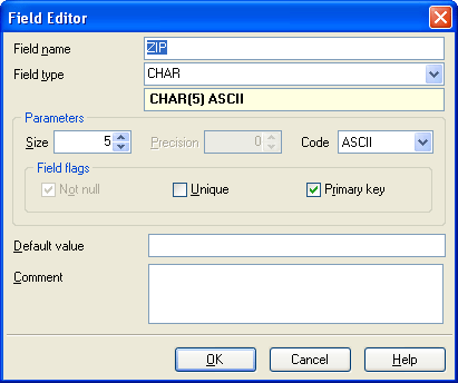 The Field Editor dialog allows you to edit the properties of table fields. It is available at the appropriate step of Create Table Wizard or from the Fields tab of Table Editor.