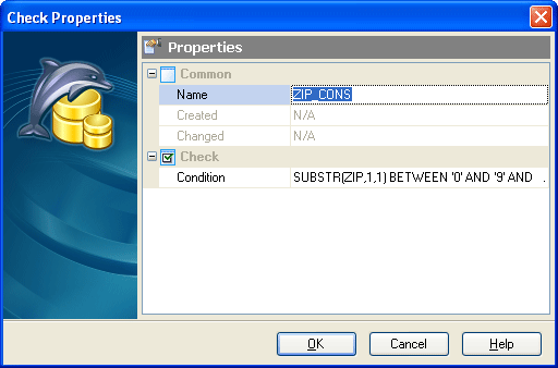 Check Properties allows you to add a new check constraint or edit an existing one. It is available from Table Editor, or from the corresponding nodes of the explorer tree.