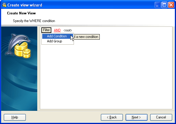 Suppose we need to select orders from the sample table Orders made between 01.01.94 and 12.29.03. These criteria are applied to the SaleDate column. Click the button to add new condition button. This will add a new condition to the criteria. Alternatively, you can use the Filter button and select the Add Condition option from the drop-down menu.